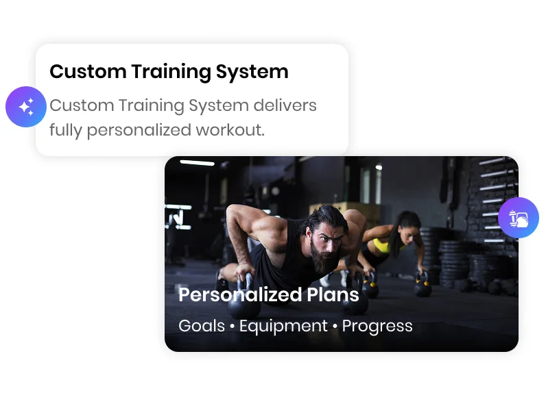 Custom Training System delivers fully personalized workout plans based on individual fitness levels, goals, and equipment availability.